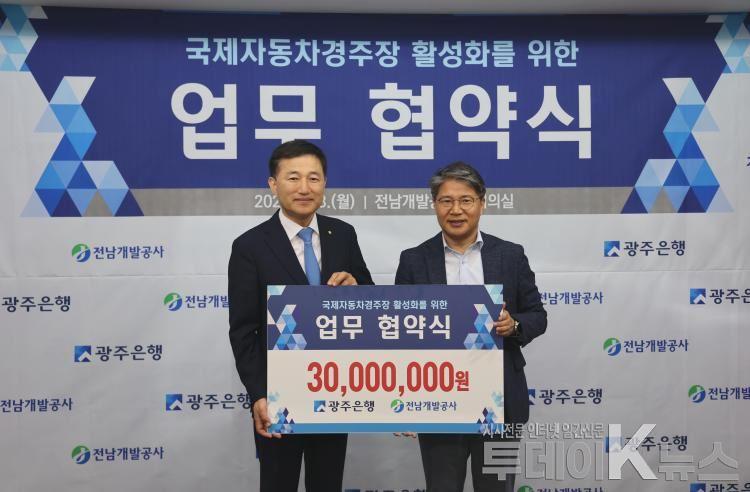[투데이K뉴스]윤진성 기자 =전남개발공사(사장 장충모)와 광주은행(은행장 고병일)은 모터스포츠 활성화를 위한 업무협약을 6월 3일(월) 체결하였다고 밝혔다. 광주은행은 지역의 대표 금융기업으로 모터스포츠 활성화를 위해 2020년부터 지속적으로 후원하고 있으며, 대회 활성화와 인재육성을 위해 금년에도 3,000만원을 후