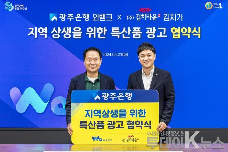 [투데이K뉴스]윤진성 기자 =광주은행(은행장 고병일)은 최근 광주은행 본점에서 정휴선 ㈜김치타운 대표, 선종윤 광주은행 디지털플랫폼부장 및 관계자가 참석한 가운데 지역 특산물 광고에 대한 업무협약을 맺고, ‘와요장터’ 서비스를 신규로 제공한다고 밝혔다. 이번 협약은 지역사회와 상생금융을 실천하고 있는 광주은행이 사회적