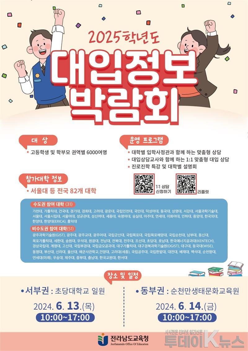 [투데이K뉴스]윤진성 기자 =전라남도교육청이 오는 13일(수) 초당대학교, 14일(금) 전라남도교육청순천만생태문화교육원에서 2025학년도 대입정보 박람회를 개최한다. 이번 박람회는 의대 정원 확대와 무전공 선발 등 변수가 많아진 2025학년도 대학 입시에 대한 수험생과 학부모의 궁금증을 해소하고 수시 지원 전략을 세우