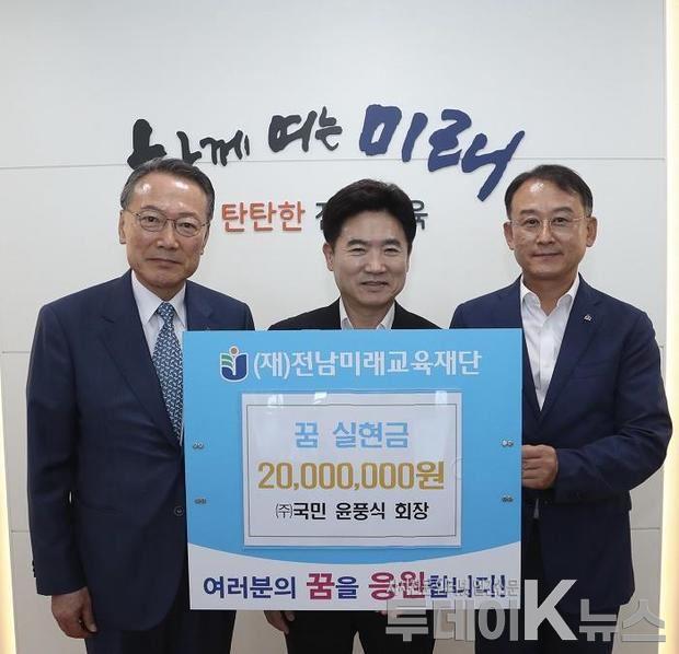 [투데이K뉴스]윤진성 기자 =윤풍식 ㈜국민 회장이 12일 전남미래교육재단에 꿈 실현금 2,000만원을 전달했으며, 기탁식에는 손세현 ㈜국민산업 회장도 함께 참석했다. 꿈 실현금은 일회성 장학금이 아닌, 학생들이 자신의 꿈을 설계하고 자기주도적으로 장학금을 사용하도록 지원하는 전남형 인재육성 장학 사업이다. 윤풍식 회