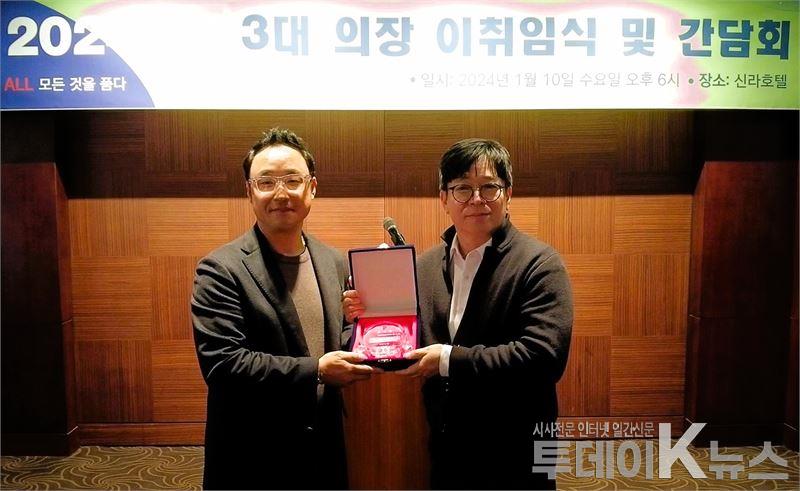 ▲서울 중구 신라호텔 마로니에홀에서 진행된 품(Poom) 이취임식에 서 1,2대 의장을 지낸 남기원 NK코리아 대표(오른쪽)가 3대 의장 선임된 성재용 르뗀갤러리 대표(왼쪽).